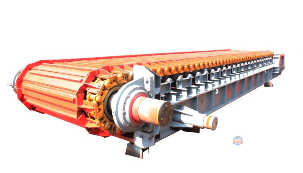 采用節(jié)距為228.6mm的高強(qiáng)度模鍛鏈條為牽引件,兩根鏈條繞過(guò)安裝在機(jī)體頭部的一對(duì)驅(qū)動(dòng)鏈輪和機(jī)體尾部的一對(duì)張緊輪聯(lián)成封閉形回路,在兩排鏈條的每個(gè)鏈節(jié)上裝配了相互交迭的、重型結(jié)構(gòu)的輸送槽而成為一個(gè)連續(xù)的能夠運(yùn)載物料的輸送線路。其自重和物料的重量由安裝在機(jī)體上的多排支重輪、鏈托輪和滑道梁支承。傳動(dòng)系統(tǒng)經(jīng)交流變頻調(diào)速電動(dòng)機(jī)聯(lián)接減速機(jī),再由漲套與驅(qū)動(dòng)裝置直聯(lián)驅(qū)動(dòng)運(yùn)載機(jī)構(gòu)低速運(yùn)行。將尾部料倉(cāng)卸入的物料沿輸送線路運(yùn)至機(jī)體的前方排出,實(shí)現(xiàn)向下方的工作機(jī)械連續(xù)均勻喂料的目的.