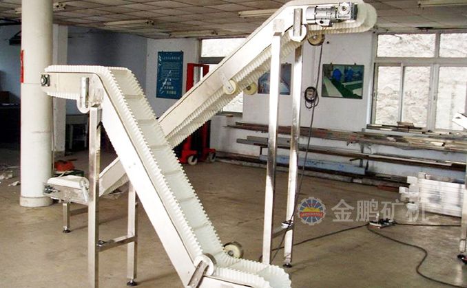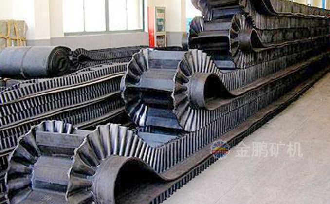 波狀擋邊輸送帶中以大傾角波狀擋邊輸送帶最有名,大傾角波狀擋邊輸送帶又叫裙邊隔板輸送帶,是由基帶、擋邊、橫隔板3部分組成。擋邊起防止物料測(cè)滑撒落的作用。為便于繞過(guò)滾筒,檔邊設(shè)計(jì)成波紋狀;橫隔板的作用是承托物料,為了實(shí)現(xiàn)大傾角輸送,采用T型TC型。檔邊和橫隔板是用二次硫化的方法與基帶連接的,具有很高的連接強(qiáng)度。