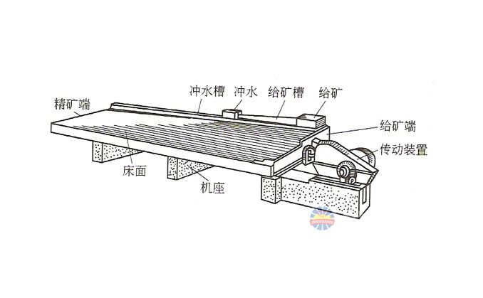 搖床分選是在床面和橫向水流的共同作用下實(shí)現(xiàn)的,床面上床條或刻槽是縱向的,與水流方向近于垂直,水流橫向流過(guò)時(shí)在溝槽內(nèi)形成渦流,渦流和床面搖動(dòng)的共同作用可使礦砂層松散并按密度分層。