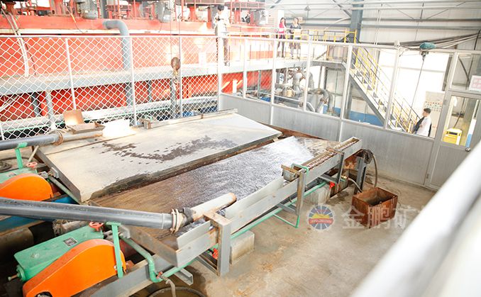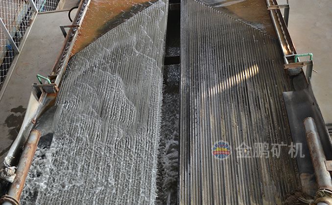 礦粒群從6s搖床床面上角的給礦槽送入,同時由給水槽供給橫向沖洗水,于是礦粒在重力,橫向流水沖力,床面作往復不對稱運動所產生的慣性和摩擦力的作用下,按比重和粒度分層,并沿床面作縱向運動和沿傾斜床面作橫向運動。比重和粒度不同的礦粒沿著各自的運動方向逐漸扇形流下,分別從搖床精礦端和尾礦側的不同區排出,最后被分成精礦,中礦和尾礦。